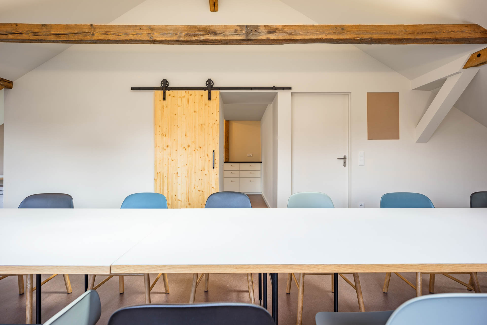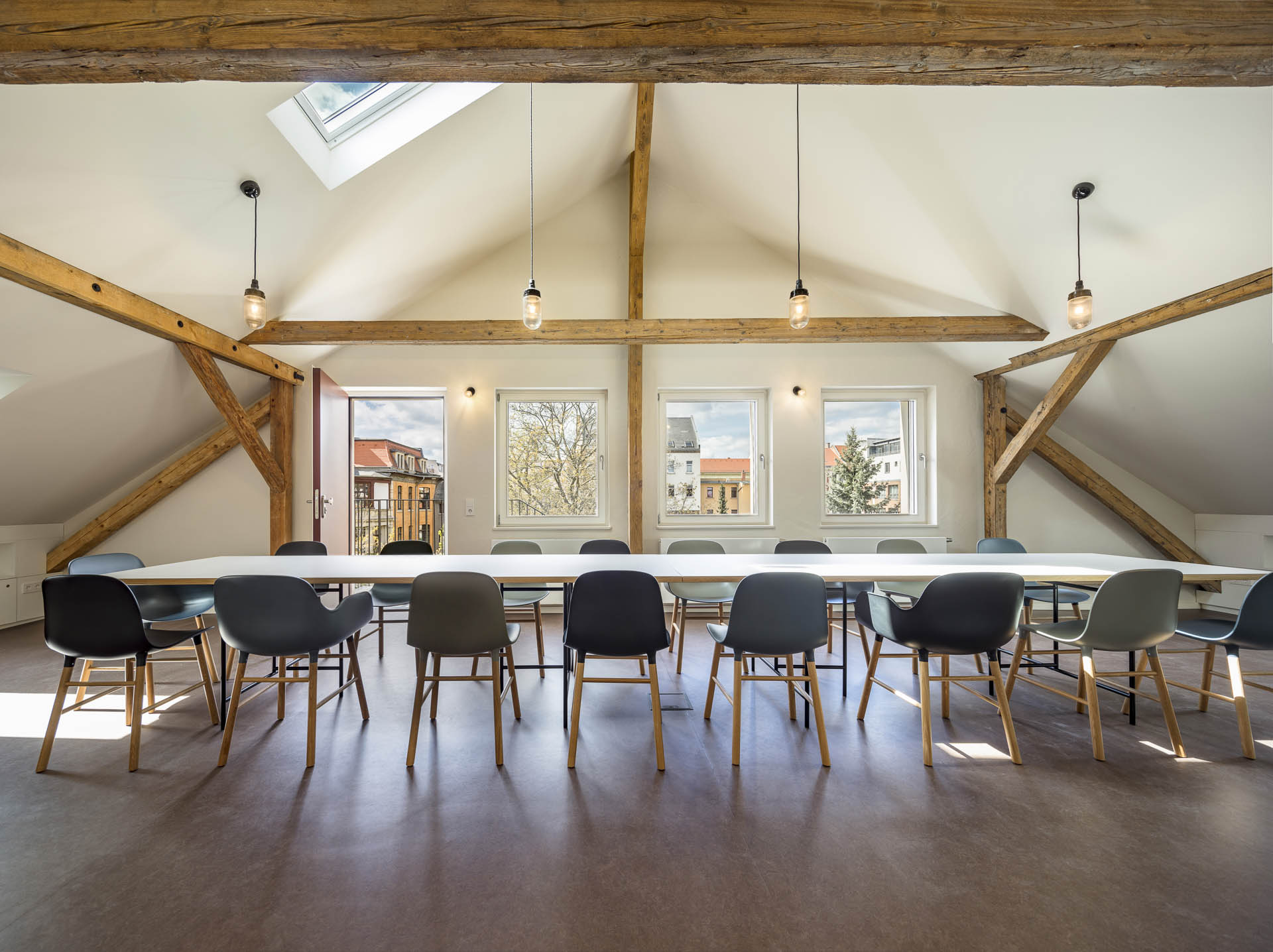 Hierfür wurde ein Teil des als Lager genutzten Dachbodens ausgebaut. Durch Öffnen des Giebelmauerwerks entsteht ein lichtdurchfluteter Raum mit einmaliger Quartiersperspektive.
