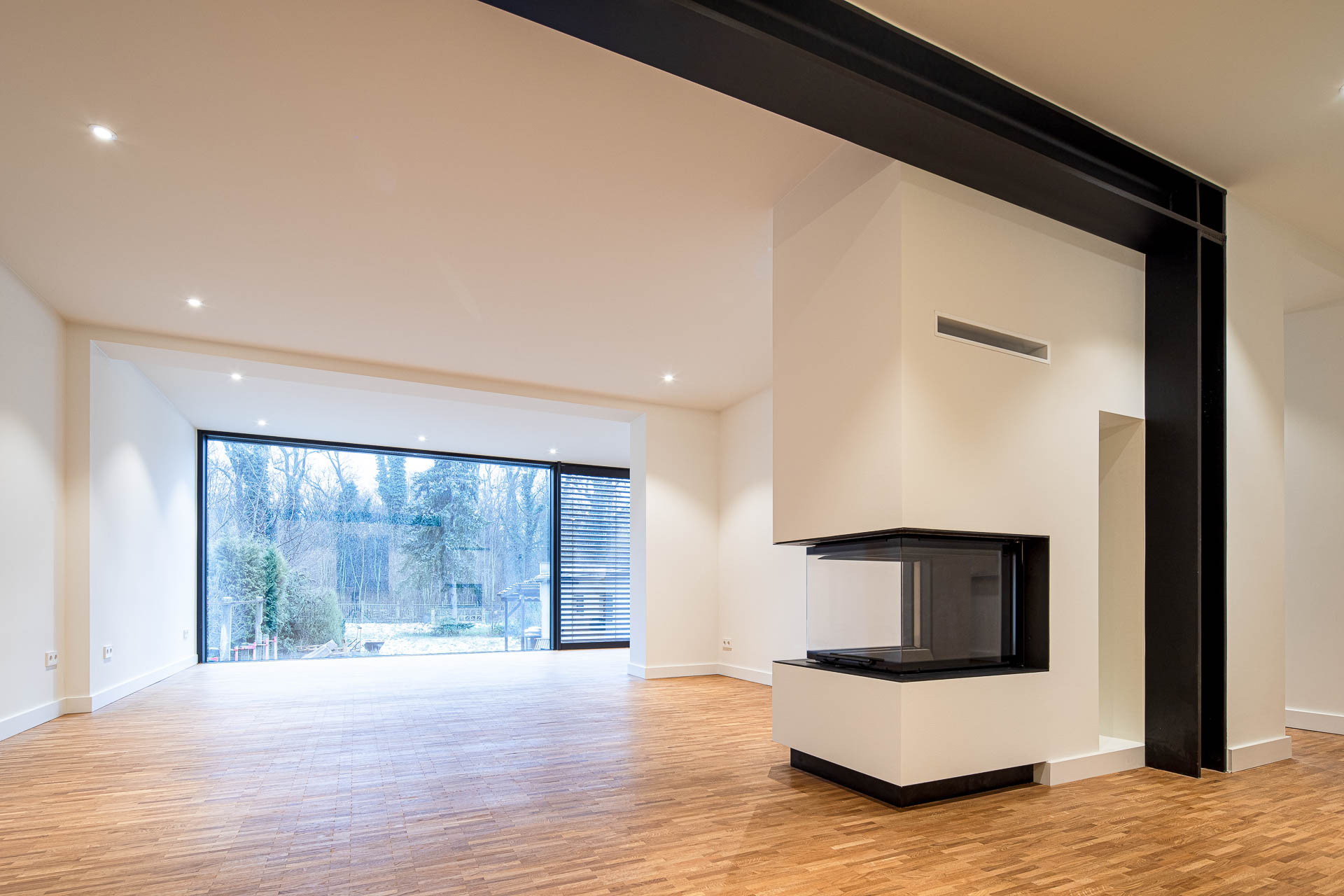Dreh- und Angelpunkt für das Familienleben im Haus wird das Erdgeschoss mit dem dreiseitig verglasten Kamin. Hier entsteht durch Rückbau der Mittelwand und den Verzicht auf Türen ein Raumverbund. Bewusst sichtbar gelassene schwarz lackierte Stahlträger und -stützen verdeutlichen ihre statische Funktion. Sie kontrastieren reizvoll mit den weißen Wänden und dem warmen Eiche- Parkettboden.