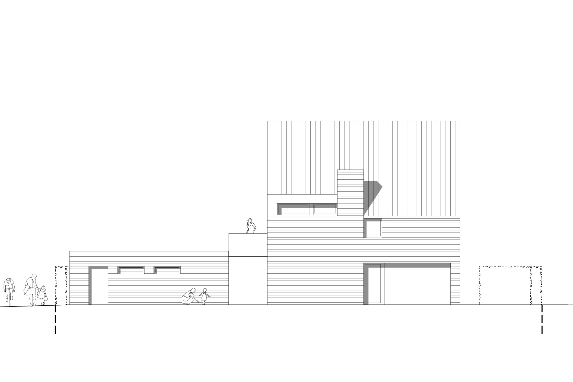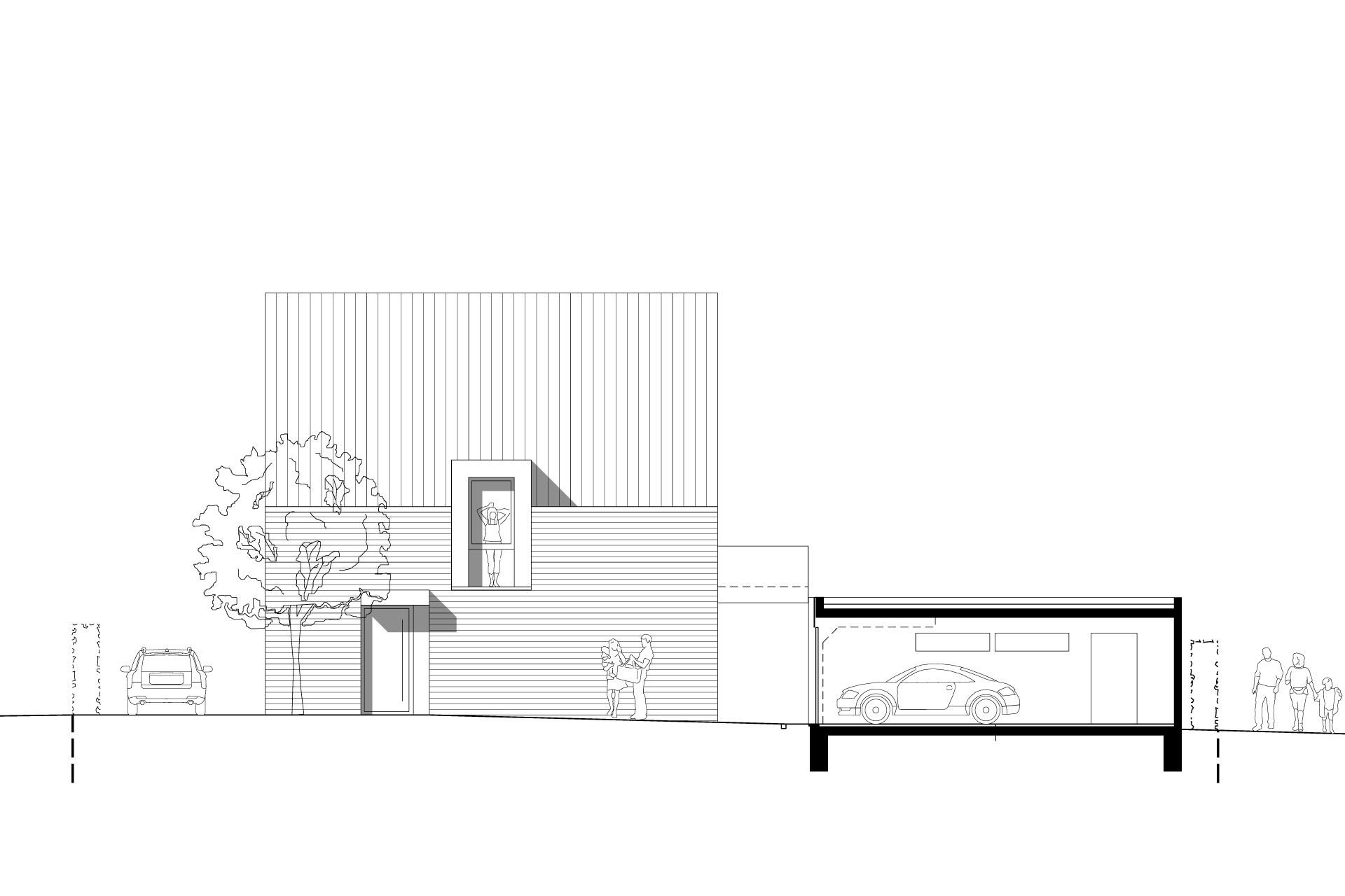Dies ist ein typisches Einfamilienhaus. Auf den ersten Blick. Doch auf den zweiten zeigt es sein kreatives Spiel mit Räumen und Flächen. Für die Eltern gibt es einen eigenen Bereich mit Ankleide, Sauna und Balkon zum anschließenden Abkühlen.