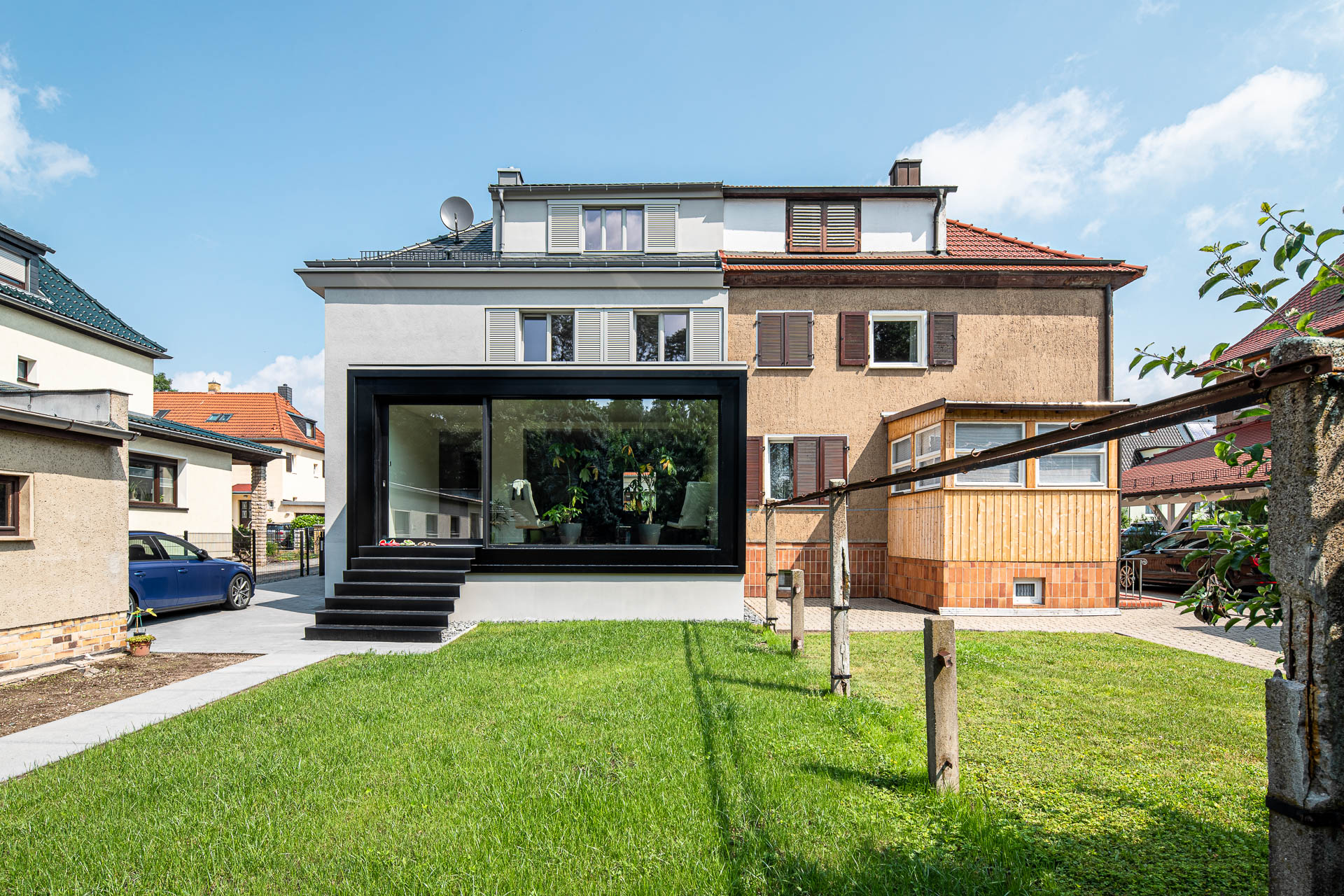 - Erweiterung des Wohnbereichs durch einen breiteren, grenzständigen Anbau.