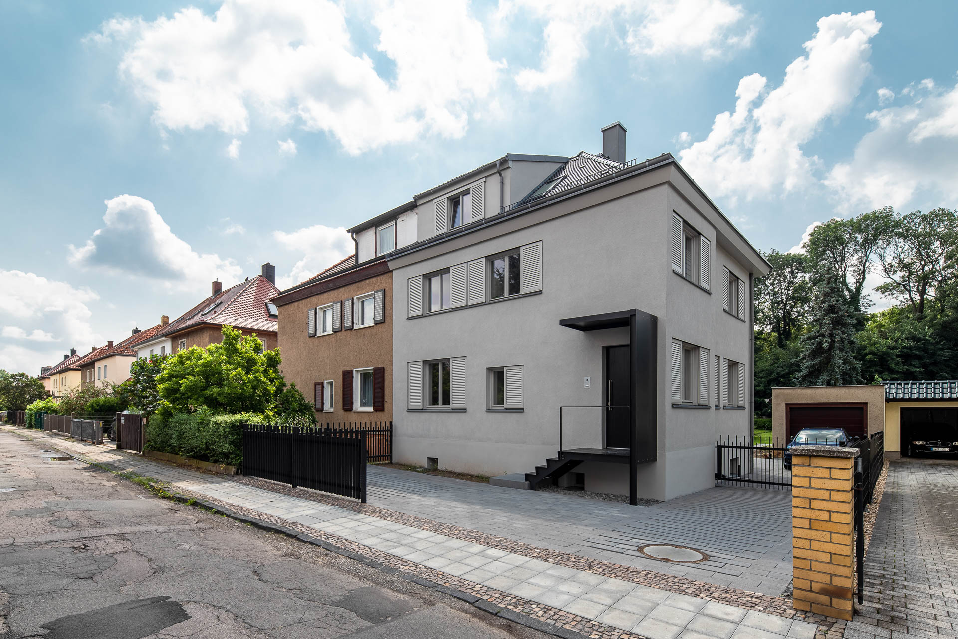 Das Verlegen des Hauseingangs zur Straßenseite ermöglicht nun die uneingeschränkte Nutzung der Garagenzufahrt. Der stählerne Eingangsvorbau sowie das gerahmte Portal des gartenseitigen Anbaus erhielten ein seidenmattes Signalschwarz – ein starker Kontrast zur mittelgrauen Putzfassade.